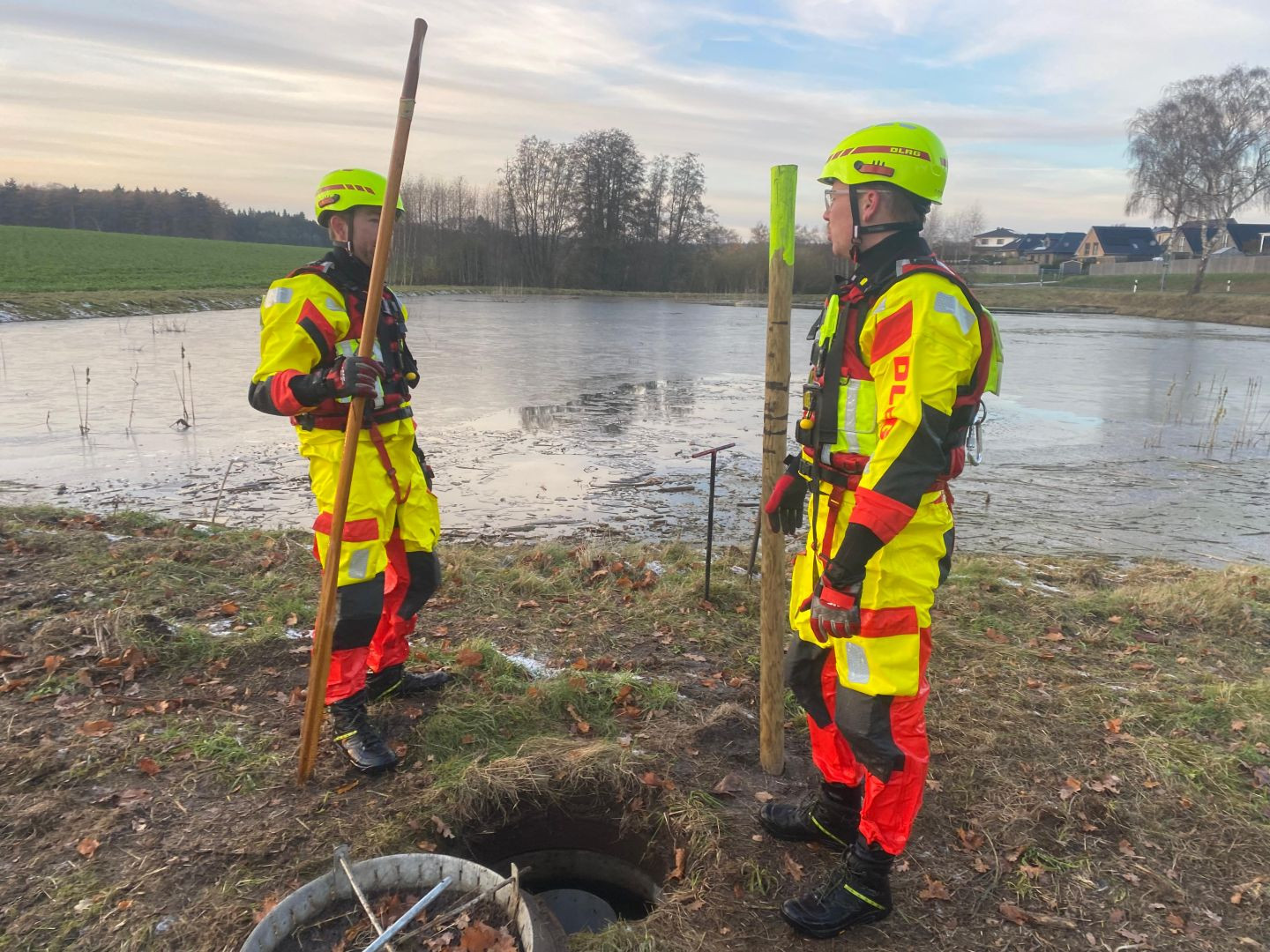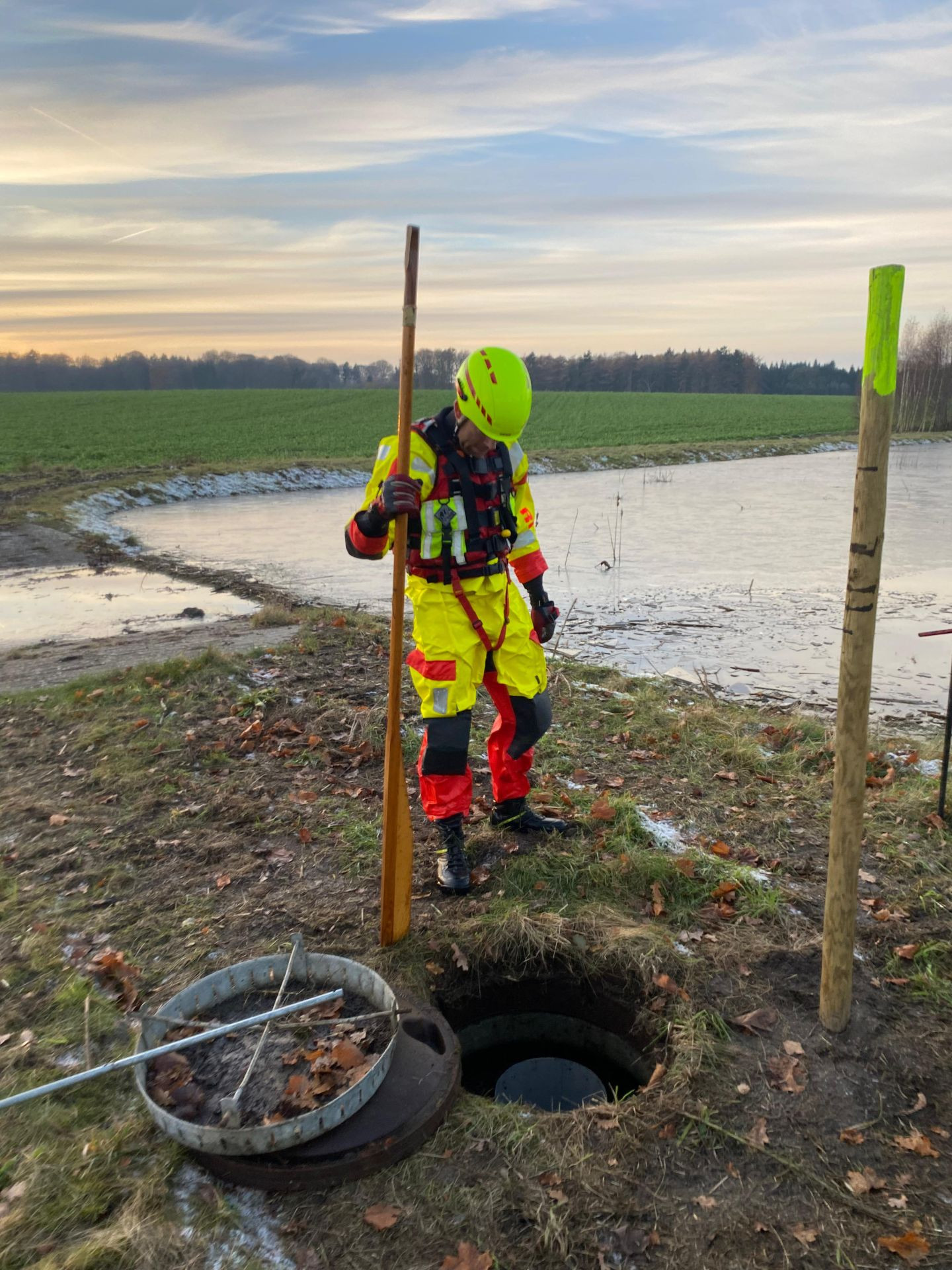 Bei eisigen Temperaturen machten wir uns auf die Suche nach der Ursache. Das Abflussgitter lag rund 1,5 Meter unter Wasser und war zusätzlich mit Pflanzenresten zugesetzt. Nach der Lokalisierung konnten wir das Gitter sowie den unmittelbaren Bereich darum herum freilegen – und das aufgestaute Wasser begann langsam abzulaufen.